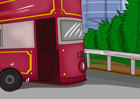 The executives are standing on the signature sightseeing bus of Hong Kong with bauhinia windmills in hand. There are landmark buildings of Hong Kong to be background. The Bank of China Tower, HSBC building, etc.